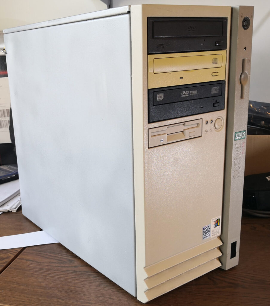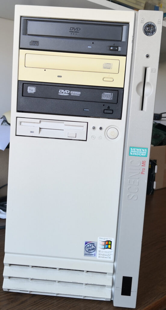 Not of worth anything for the sake of keeping in “little private museum” is a Pentium II based computer that gave up the ghost a while ago. For personal reasons I do not want to share here, the worthless case has some sentimental value which is why I didn’t throw it away despite it was in remarkable bad condition from the outside. So I grabbed a spray can and sprayed the removable housing parts in gray. Not good, but way better than before.