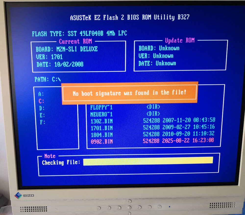Not quite. Last thing I want to mention is the BIOS update. There is support for flashing a new version right from BIOS without having to boot a DOS based operating system. Very modern! I downloaded the latest stable version, put it on a FAT32 formatted flash drive and started “ASUS EZ Flash 2” utility from the BIOS. Guess what: Error message. No matter what version I tried it always said, “No boot signature was found in the file!”